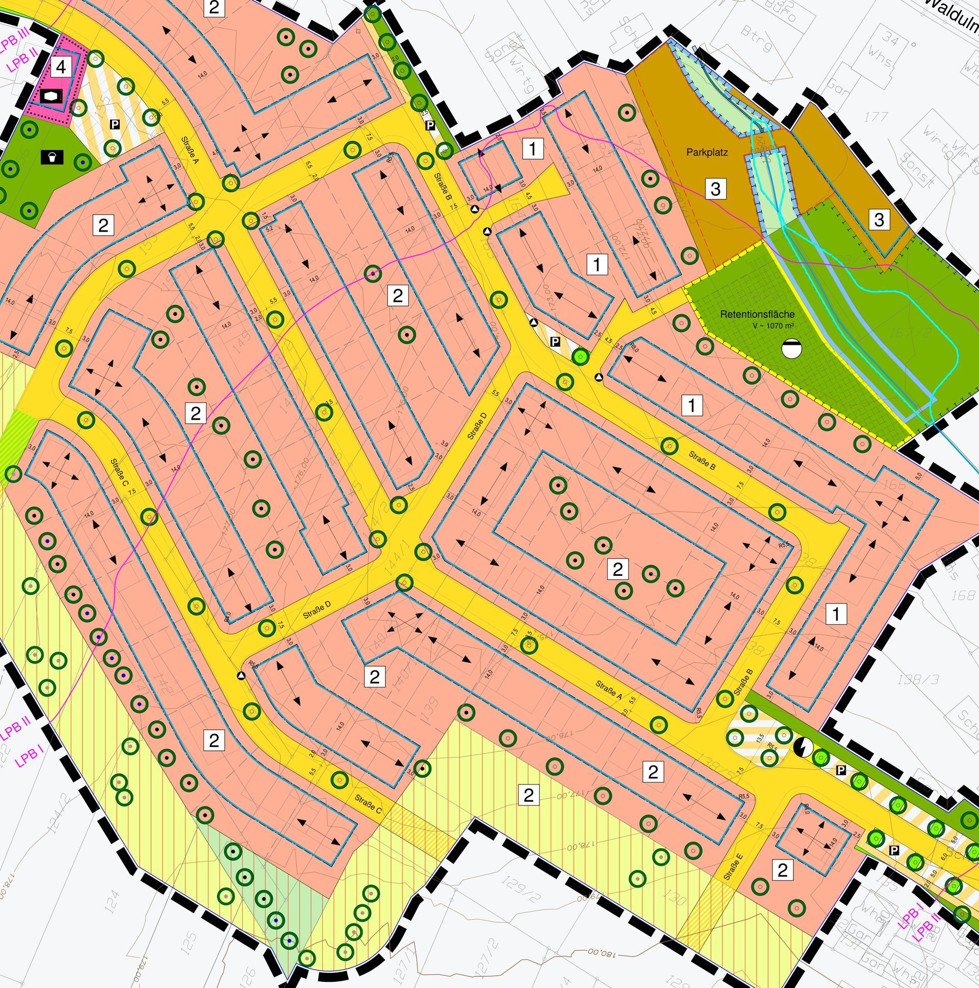 Das Baugebiet ist ca. 2 ha groß und es entstehen 23 Baugrundstücke, darunter eines für Geschoßwohnungsbau und eines zur Bebauung mit mehreren Gebäuden durch einen Bauträger. Im Juli wurde mit den Bauarbeiten begonnen und Mitte 2024 soll die Erschließungsanlage hergestellt sein. Insgesamt kostet die Erschließung ca. 4,2 Mio. €. Pro qm Bauplatzfläche sind ca. 280,- €/qm kalkuliert.
